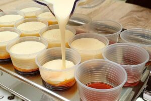 Coloque uma pequena porção da calda no fundo de copinhos descartáveis ou potes com tampa. Em seguida, complete com a mistura do pudim.