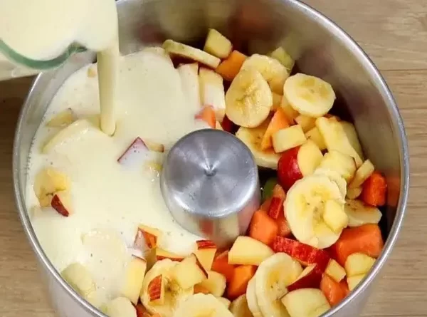 Com o liquidificador ligado em velocidade baixa, adicione a gelatina dissolvida e bata por mais alguns segundos.