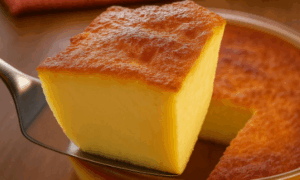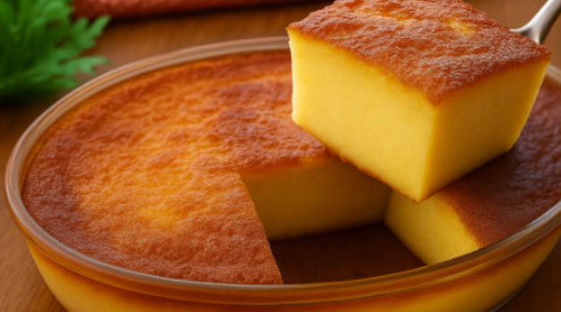 Mas o diferencial dessa receita está na textura: ele não fica como um bolo comum, sequinho. Esse bolo tem um centro molhadinho, cremoso, quase como um pudim misturado com bolo, enquanto a parte de cima fica levemente dourada e macia. É simplesmente irresistível!
