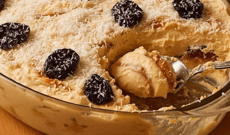 Jogue bastante coco ralado por cima e coloque algumas ameixas para decorar.
