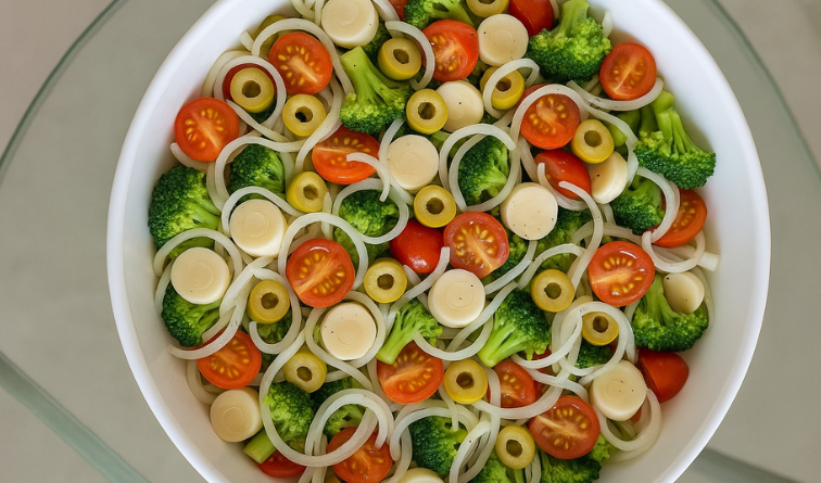 Enquanto o brócolis esfria um pouquinho, pegue uma tigela grande e capriche, porque salada gosta de espaço. Coloque os tomates-cereja cortados ao meio, as azeitonas fatiadas, o palmito em rodelas e a cebola branca bem fininha. Misture tudo com delicadeza, como quem está ajeitando flores em um vaso.